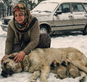 Eve doğru giden genç bir kadın, Erzurum’un şehirlerarası yolunda, yol kenarında donmak üzere olan bir dişi köpek ve yanında soğuktan…